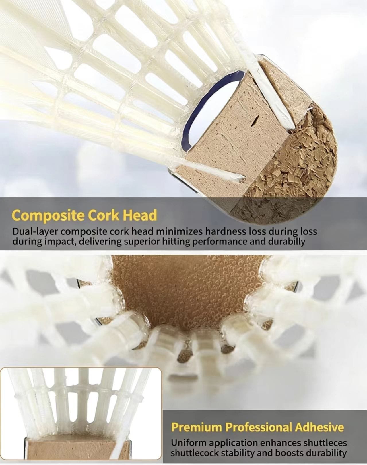1. Material: Our badminton shuttlecocks are crafted using high-quality materials, ensuring durability and optimal performance. The feathers are sourced from reputable suppliers, providing excellent flight stability and accuracy.
